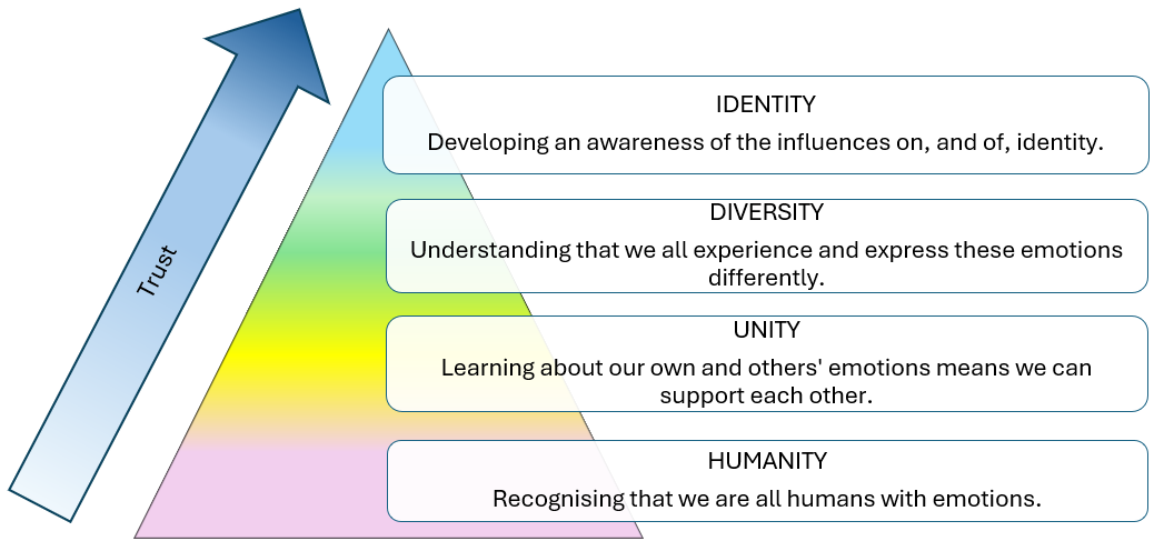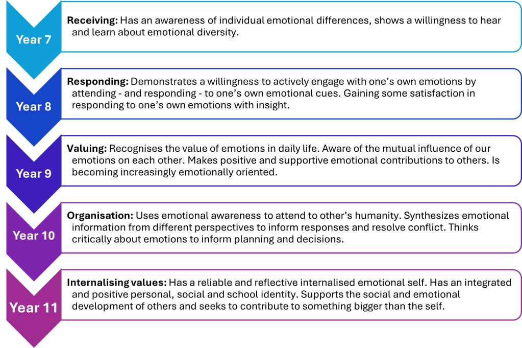 The outcomes show the goals of Connecting Through Colour, working with the pastoral teams and the school’s overall approach. These outcomes are based on Bloom’s Affective Taxonomy (Anderson & Krathwohl, 2009) to illustrate progress, while also acknowledging that growth is a personal and non-linear journey that depends on each student’s unique starting point and situation.
