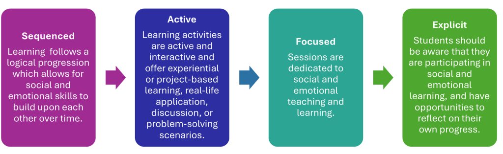 The Education Endowment Foundation and CASEL advocate for the SAFE principles in social and emotional learning. Meta-analyses show that approaches meeting all four SAFE criteria are more effective in enhancing social and emotional competencies and prosocial behaviors (Cipriano et al., 2023). Connecting Through Colour is based on these best practice principles.